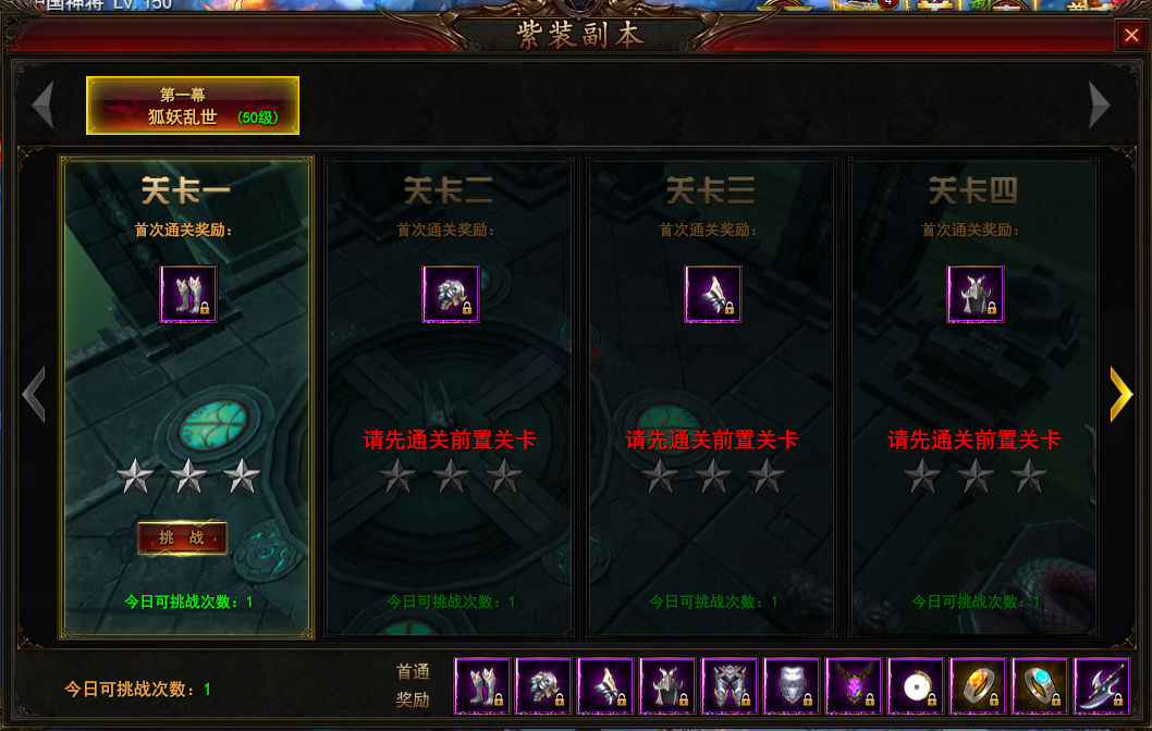 l 第一种:紫装副本,紫装副本每个角色生涯有且只有一次机会进行挑战,挑战完所有十一关副本可集齐一套紫色装备。
